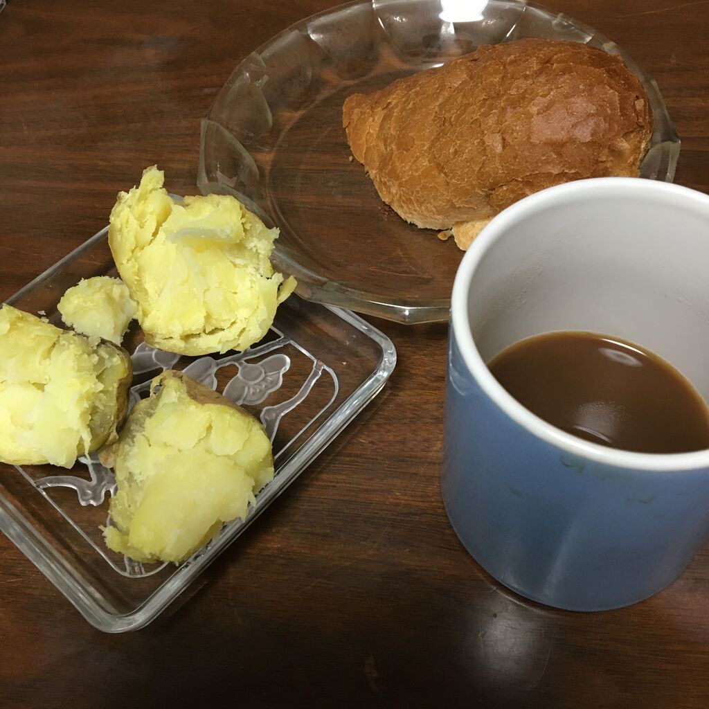 レンチンしたジャガイモと、フランスパンの残りと、昼間飲んだコーヒーの残りの夕食。